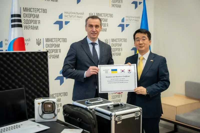 На базі Національного інституту раку відбулася передача 100 портативних рентгенівських апаратів, які були надані Україні за сприяння Республіки Корея через організацію KOICA. У заході взяли участь міністр охорони здоров’я Віктор Ляшко, посол Кореї в Україні Пак Кічанг, а також представники медичних установ і KOICA.